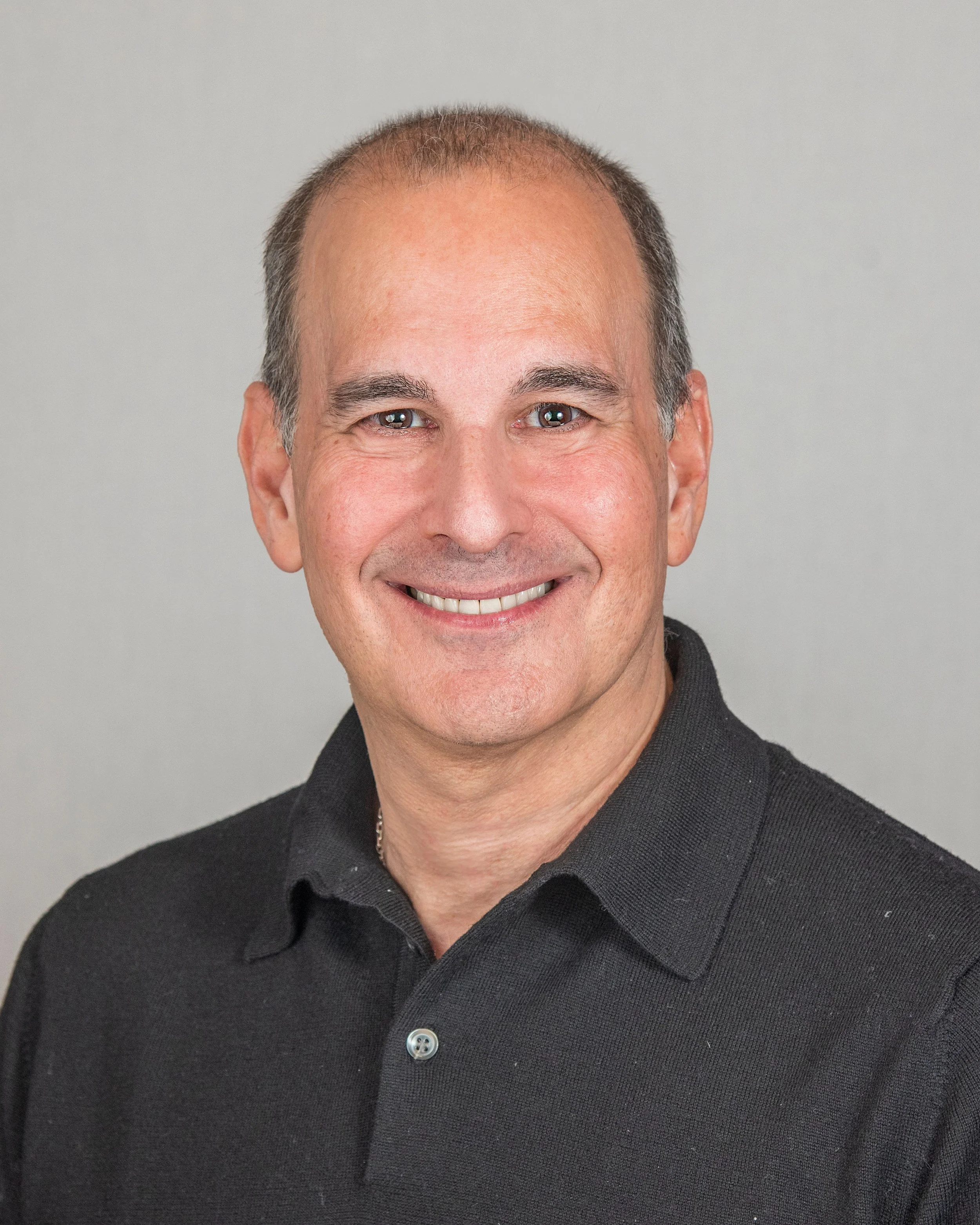 Headshot of a smiling middle-aged man with short brown hair, wearing a black collared shirt, against a light gray background.